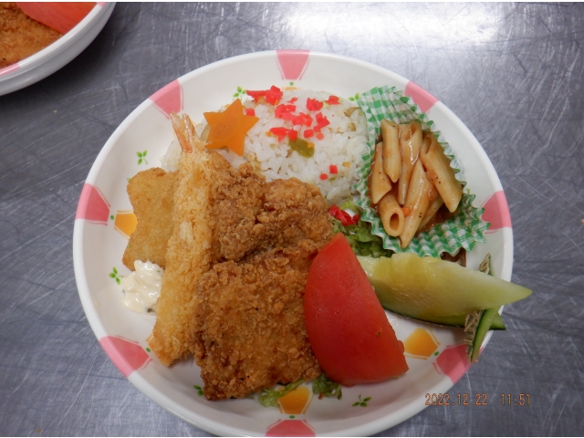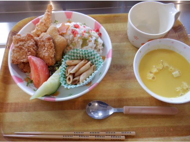 クリスマス会の昼食は、ワンプレートでピラフ、フライ、サラダとメロンを盛り合わせ、パンプキンスープを用意しました。 利用者の皆様にクリスマスを味わっていただけたと思います。