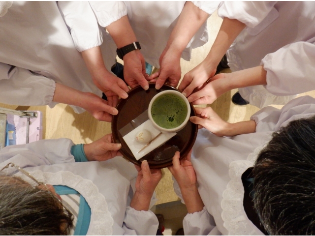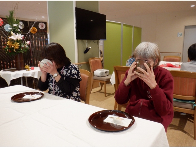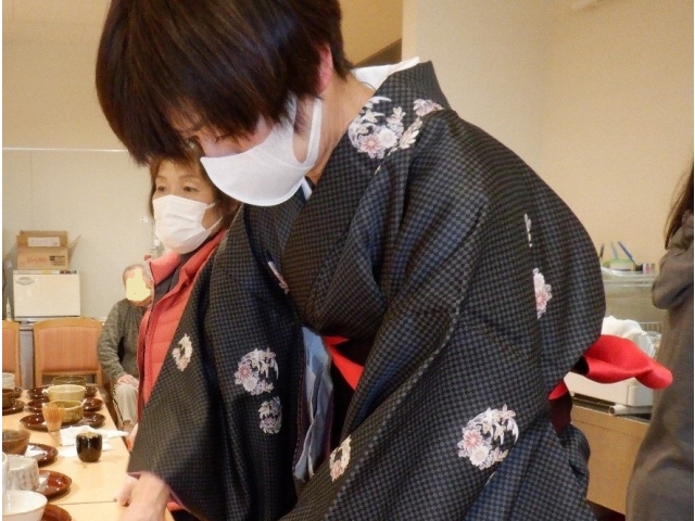 令和5年1月6日(金)に一年の初めの大きな行事として初釜を行ないました。会場に新春の飾りつけをして、利用者様の中で希望された5名様(男性3名様、女性2名様)に白い割烹着を着ていただき、お抹茶とうさぎのお饅頭を運んで頂きました。BGMに雅楽の笛の音とお琴の音を聴きながら落ち着いた雰囲気の中着物を着た職員が点てたお抹茶を「結構なお手前で」と伝える少し照れた笑顔や着物に見とれながら、ほころぶ表情が彩りを添えました。