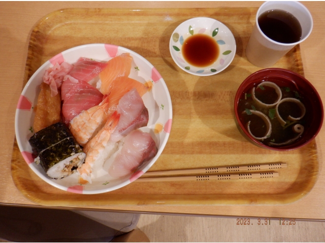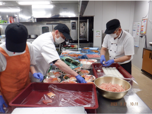 今年度最後になりましたが、利用者の皆様が大好きなお寿司を提供することができました。 朝から調理師さんたちがネタをさばき、お寿司を握ってくださいました。 今日はマグロ、サーモン、ぶり、えび、巻き寿司、揚げ寿司の盛り合わせです。 利用者の皆様の満面の笑顔や「おいしかったよ~」「また出してね~」などの声をいただきました。 これからもおいしい食事を提供できるよう栄養士・調理師一同努めていきたいと思っています。