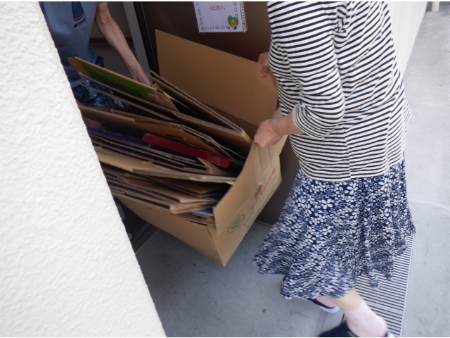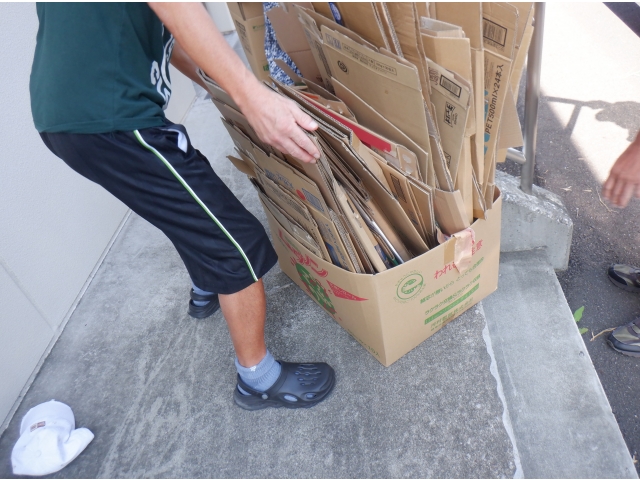 利用者様と職員で段ボールや空き缶などの廃品をまとめて運ぶ作業を行っています。そして収入は、利用者様の工賃として分配されます。
