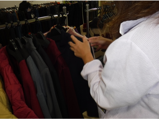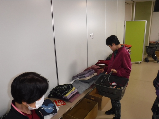 本日、気持ちの良い秋晴れの午前中に、多目的室にて女性の冬季衣類販売が行われ、秋冬物衣類の買い物を楽しまれました。皆さん時間をかけて購入する服を吟味されていました。