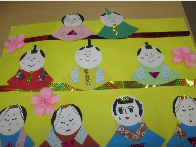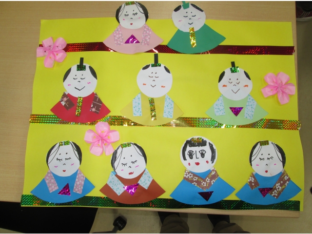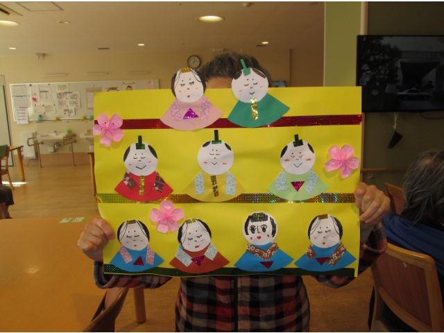 立春の今日、利用者様と桃の花、雛人形を作成し、台紙に飾り付けました。