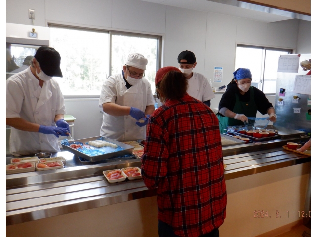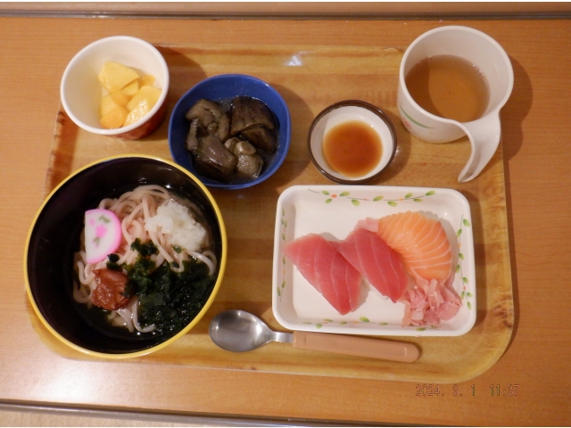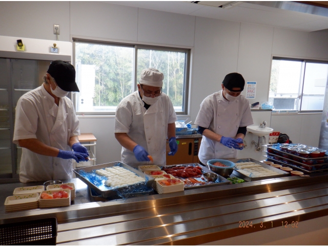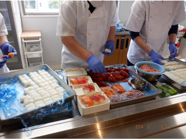 3月3日のひな祭りを前にして今日はひなまつりの食事会を開催しました。 調理師により利用者の皆様の目の前でお寿司を握り提供させていただきました。 利用者の皆様は久しぶりの握り寿司に満面の笑みをうかべおいしそうに食べている姿がとても印象的でした。 「お寿司おいしかったよ」「ありがとう」「またよろしくね」の言葉に調理師、栄養士とも励まされたひと時でした。