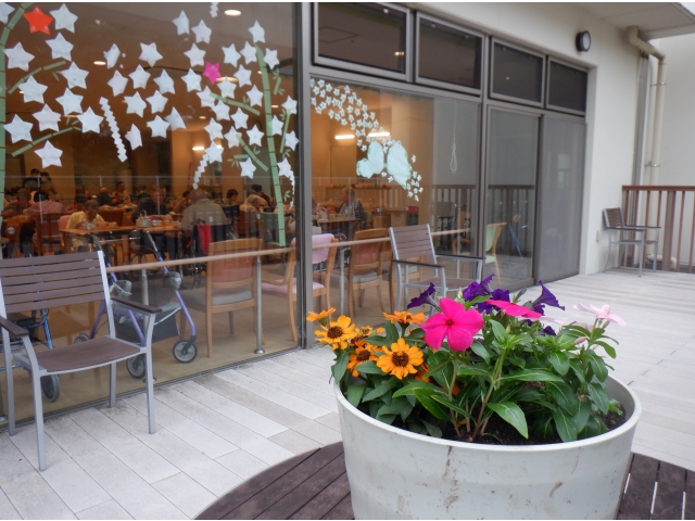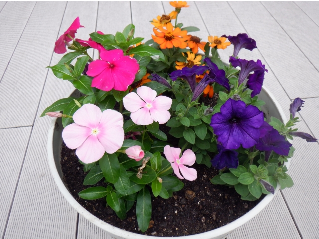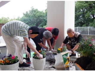 利用者様が花の配色、配置を考えて寄せ植えを行いました。🌼🌺🌻