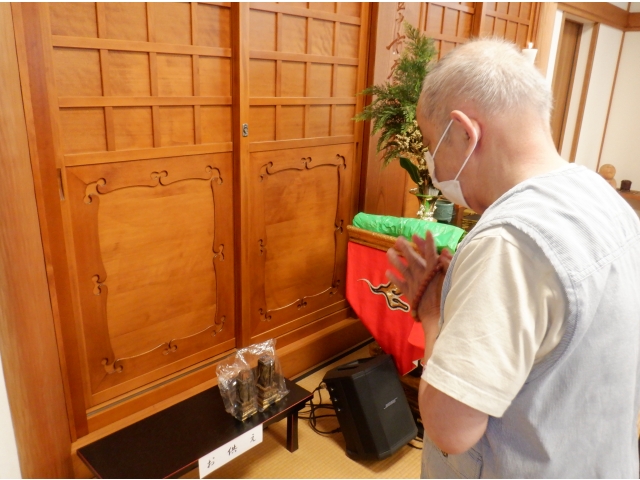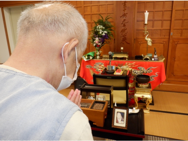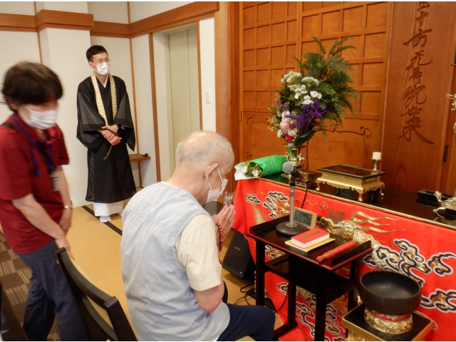 79歳S様。「おふくろの墓参りがしたい」と何度か話されていました。初夏🌞の7月、永代供養されている名古屋市のお寺へ念願の墓参りが実現しました。ご住職に法要していただき感激の面持ちでした。
