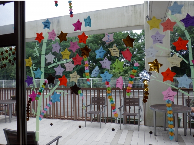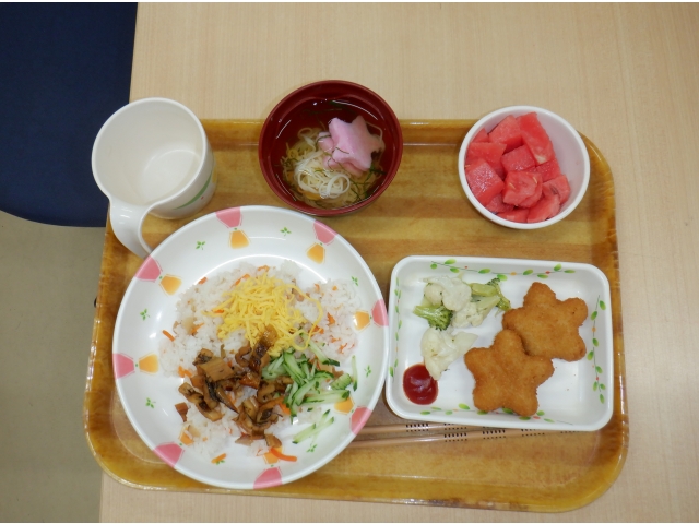行事食を目の前に「美味しいね」と笑顔。彩鮮やかちらし寿司🍣、涼やかな素麺汁、星形コロッケ🌟、真っ赤なスイカ🍉。味はもちろん、目でも楽しまれていました。