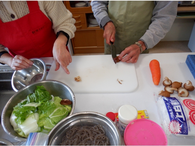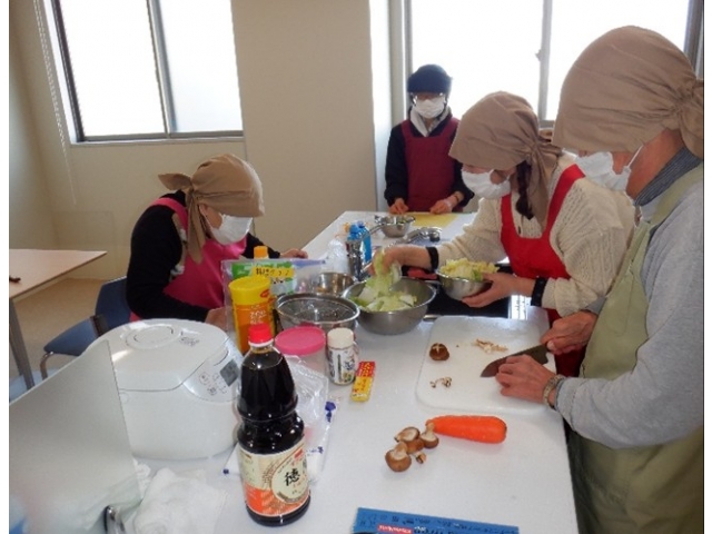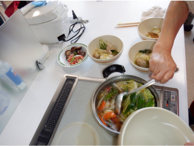 本日のメニューは、「とり鍋・ポテトサラダ・雑炊・ふかし芋」でした。みんなで相談しなら分担して調理しました。椎茸の飾り切りやとり鍋を使って雑炊までを作りました。味付けもバッチリでお腹いっぱいと言いながらも、皆さん残さず食べられました。