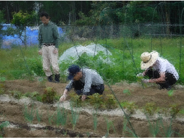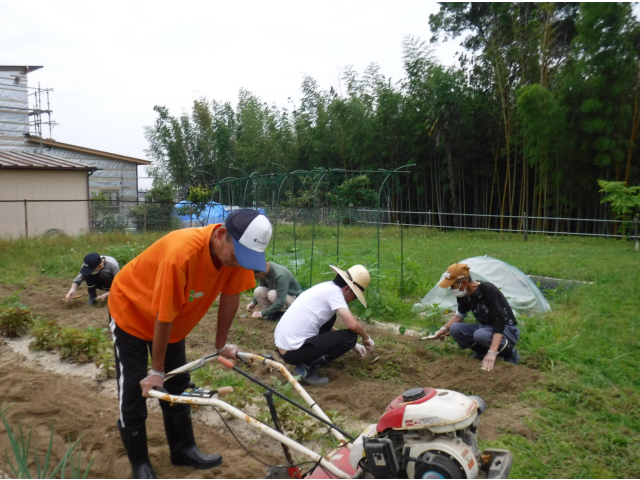 畝を起こし 野菜の苗を定植、草刈りをしました。