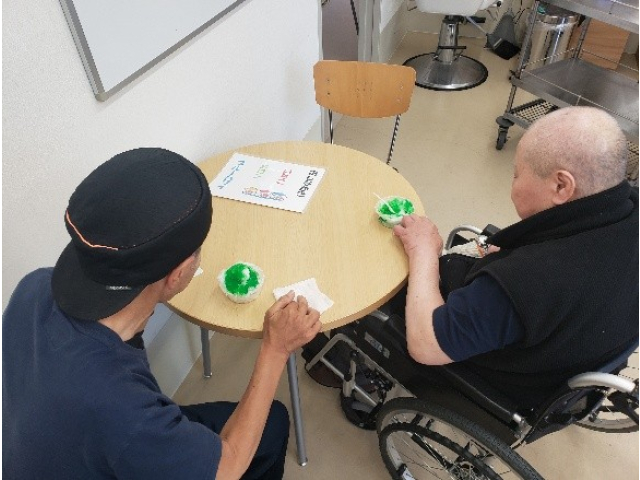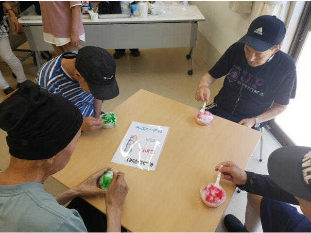 毎日 暑い日が続きますね。新生寮で毎週オープンしている、ご利用者様向けの喫茶店。今月は『かき氷』です。この日は男性ご利用者様の日。ひと口食べては「う~」と頭を抱える方がちらほら。冷たい氷に悩まされながらも😅召し上がっていました。この日の人気は定番の「いちご味」と「メロン味」でした。