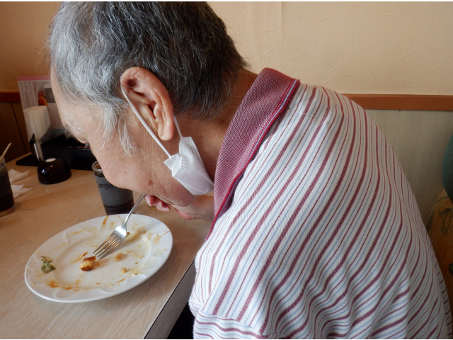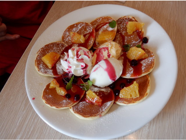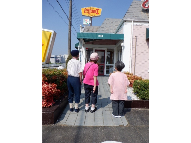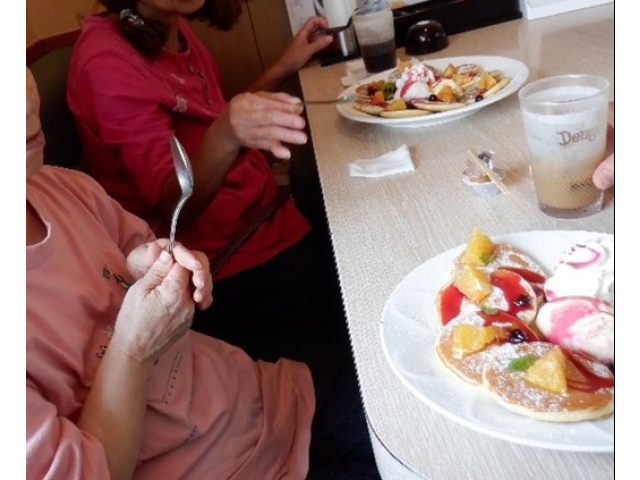 夏のお楽しみツアーでデニーズに行きました。3人ともメニューを見るとパンケーキに釘付けでした。カラフルなパンケーキを見て“きれい~!!”と言いながら完食されました。