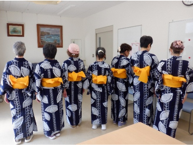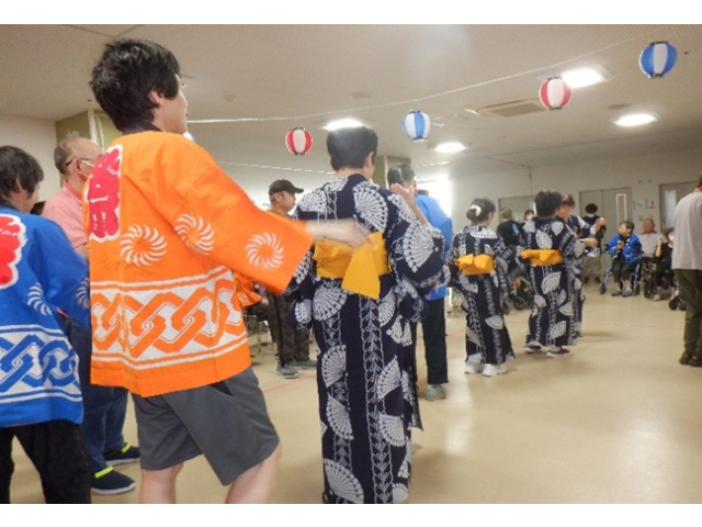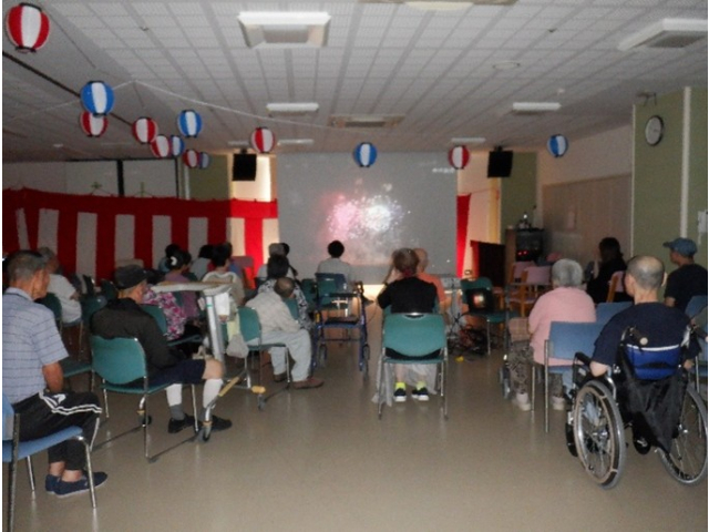 女性利用者さまは浴衣を着て、男性利用者さまは法被を着て盆踊りに参加しました。6月末より盆踊りを練習してきた成果を本番で発揮し盛り上がりました。盆踊りのあとはプロジェクターで花火🎆鑑賞を行いました。