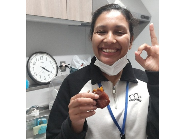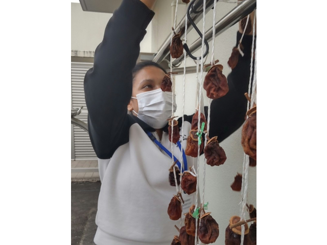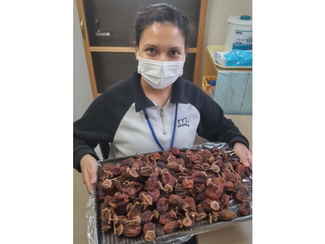 新生寮で作った干し柿を特定技能スタッフが食べました。「ネパールにも同じような果物があります。でもネパールのはそのまま食べるのでちょっと口に残る。日本のは甘い、おいしいです。」と喜んでくれました。