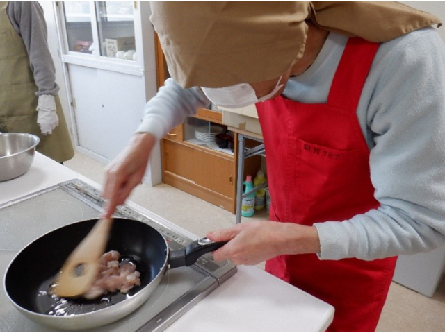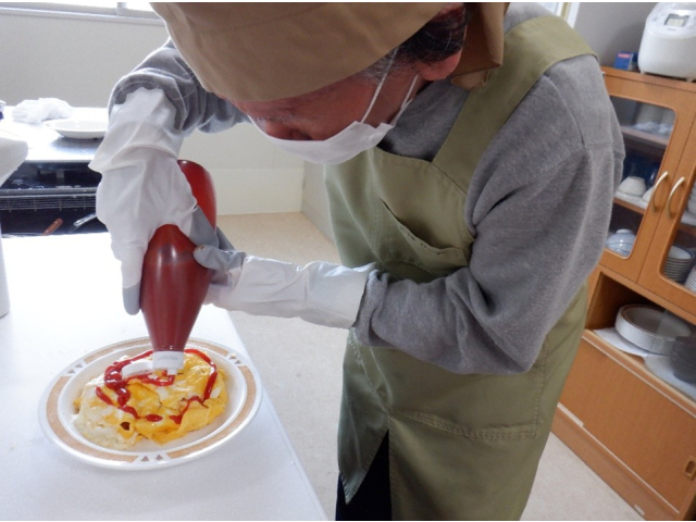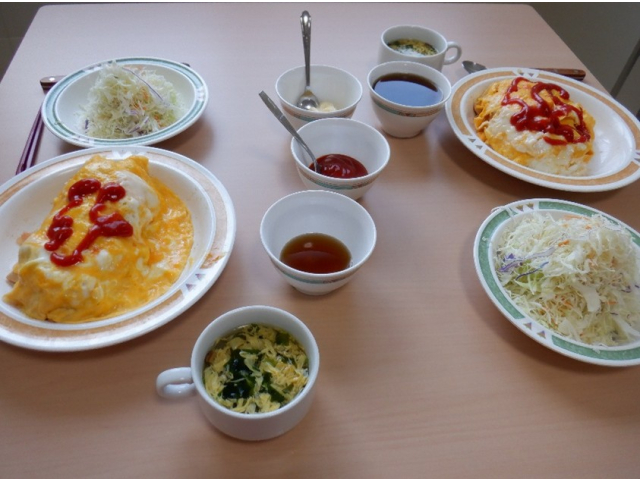 今回の料理ラブは皆さんの希望で「オムライス」となりました。二人とも初めての(ドキドキ)オムライス作りでしたが…見事成功‼おいしそうに出来上がりました。笑顔での食事となりました。