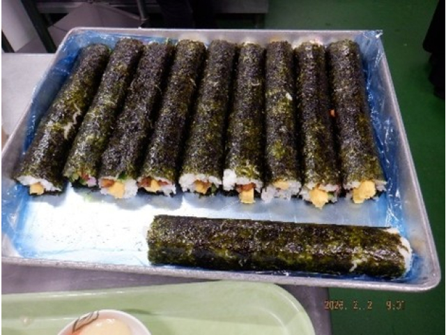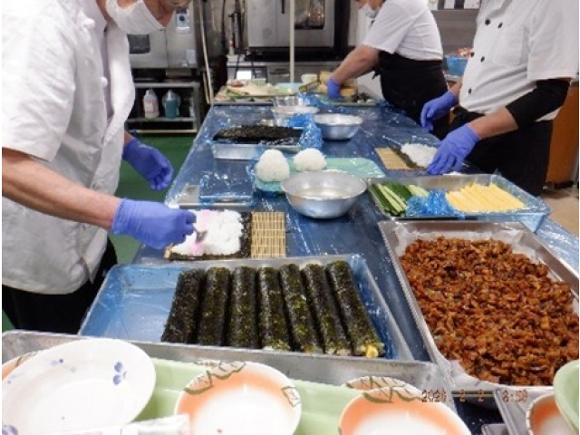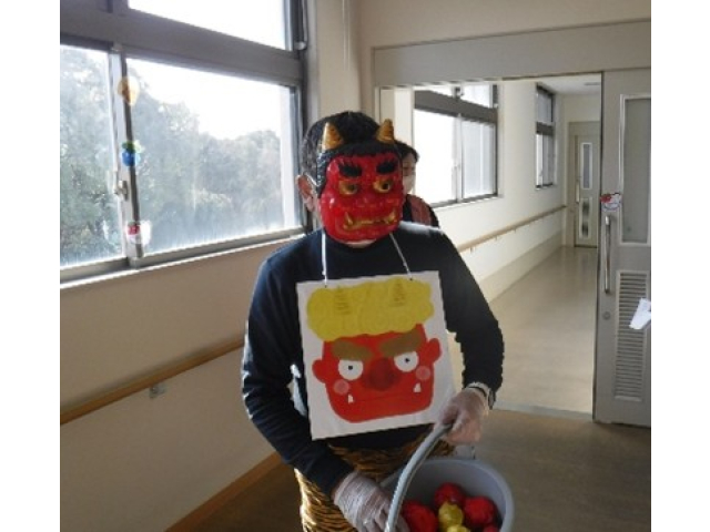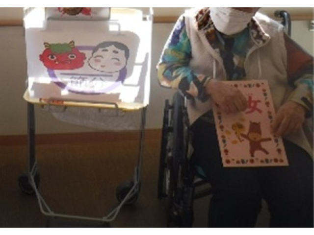 午年の年女年男は、女性:2名と男性:5名の7名です。鬼が3色の玉の中から玉を1個ずつ配り、年女年男から玉と交換で厄落としの記念品を受け取りました。昼食には厨房さんの手作り恵方巻を食べて、何事にも🐎く行くように~🐎