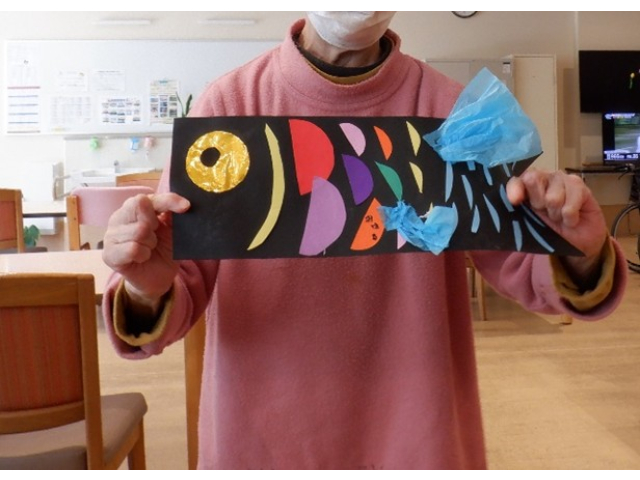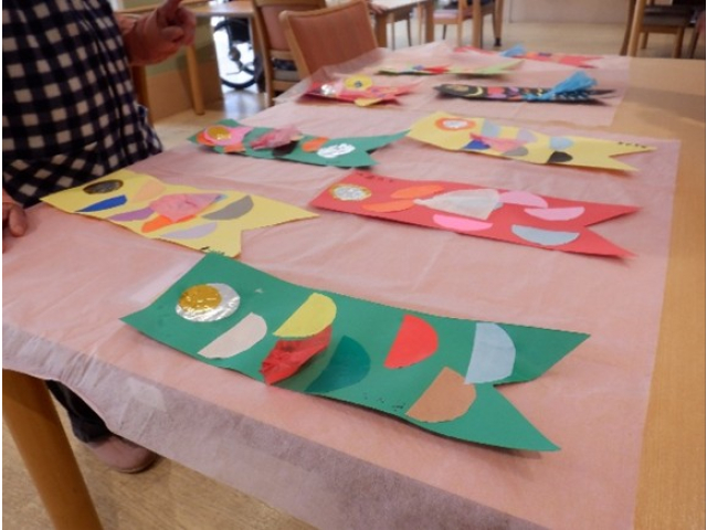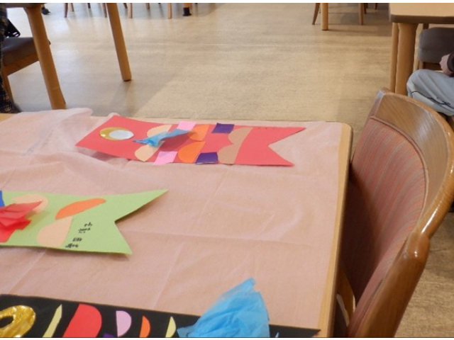 創作活動で鯉のぼりを作成しました。自身で思い思いのデザインを考え、サインペンや折り紙を使い切ったり貼ったりして作成しました。作品が「自分に似てる」と笑い声も出ました。