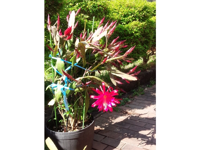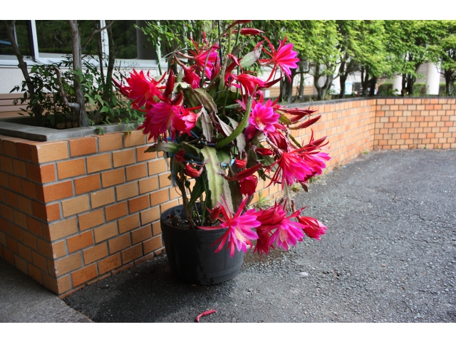 さて、すぎのきの里では、サボテンの鉢植えの花が見ごろを迎えています。連休前、利用者さんに「咲いてるよ」と教えて頂いたときにはまだ一輪しか咲いていませんでした(写真上)が……11日にはこんなに満開に!(写真下)年々その花の数が多くなっているように感じています。