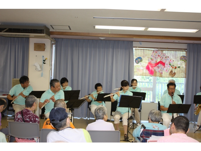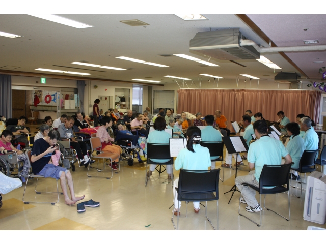 多くの利用者さんが、食堂に集合。音楽鑑賞を楽しみました。 演歌からクラッシックまで様々な幅広いジャンルの音楽を演奏し、利用者のみなさんを楽しませてくださいました。 東栄ウッドウィンドアンサンブルの皆さん、とても素敵な演奏をありがとうございました。また聞かせてほしいですね。