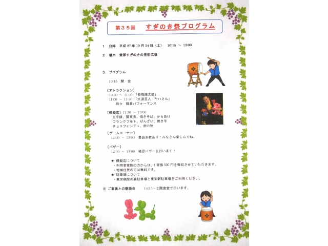 いよいよ、10月24日(土)、すぎのき祭が開催されます。 今年のすぎのき祭は、長篠陣太鼓、大道芸人のステージのほか、模擬店(チョコレートフォンデュもあるよ!)、ゲームコーナー等々を予定しています。 掘り出し物いっぱいのバザーはもちろん今年も行います! 地域の皆様始めご家族お揃いで、お気軽にお越し下さい。
