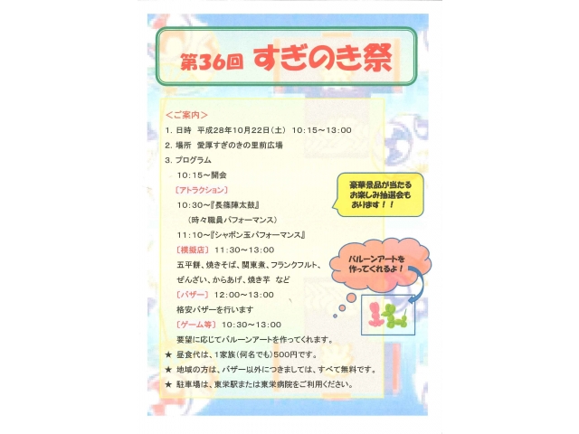いよいよ、10月22日(土)、すぎのき祭が開催されます。 今年のすぎのき祭は、長篠陣太鼓、シャボン玉パフォーマンスのステージのほか、模擬店等々を予定しています。 掘り出し物いっぱいのバザーはもちろん今年も行います! 今年はお楽しみ抽選会を実施! 地域の皆様始めご家族お揃いで、お気軽にお越し下さい。