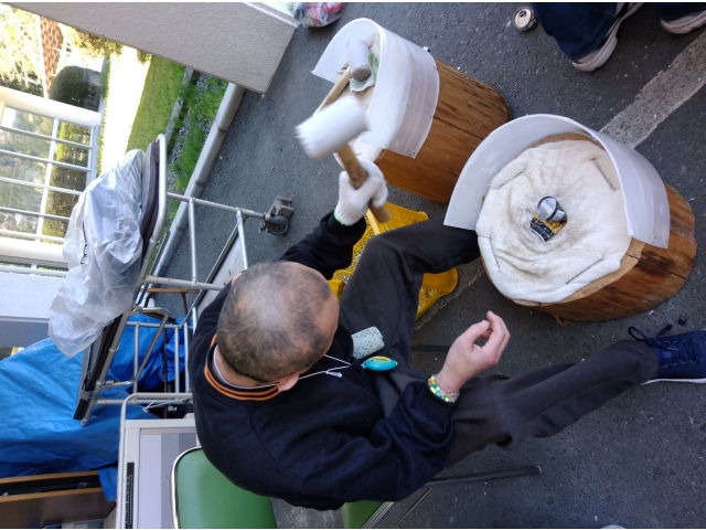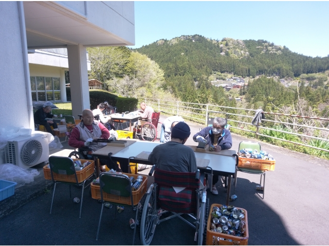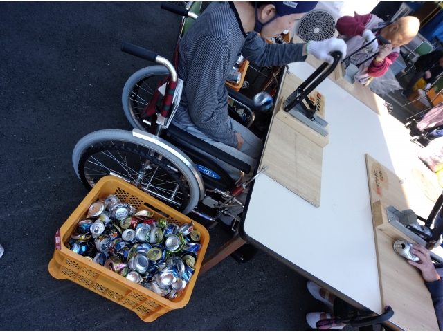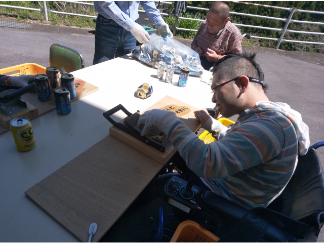 この日は7名の利用者さんが参加。それぞれ自分のペースで缶をつぶしていました。