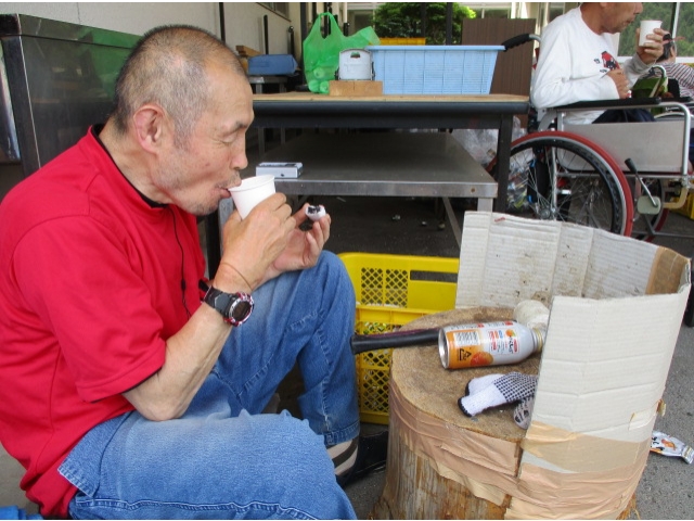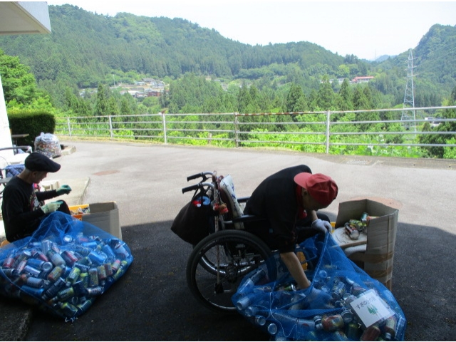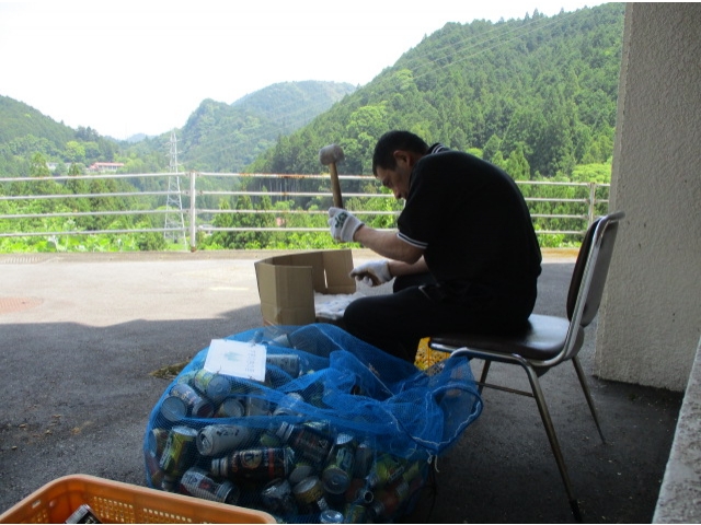 今回も澄みわたる青空の下で「缶つぶし」を行いました。前回までは、初夏のさわやかな風が吹き渡るなか、気持ちよく作業ができましたが、最近は熱中症に十分注意し、休憩をとりつつ楽しく作業をしています。水分補給と、ごく稀に甘いお菓子も出る時があります。