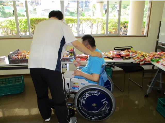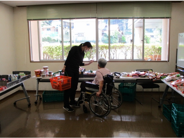 外へ出掛けての買い物がなかなかできないので、すぎのき商店を毎月オープンして買い物を楽しんでもらっています。 スナック菓子、飴、果物、ジュース、パン、ふりかけ、和菓子などの商品を揃えて営業しています。 みなさん持参のエコバックがいっぱいになるくらいお買い物をされていました。