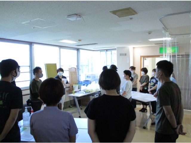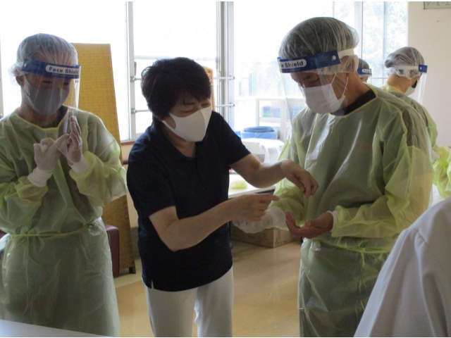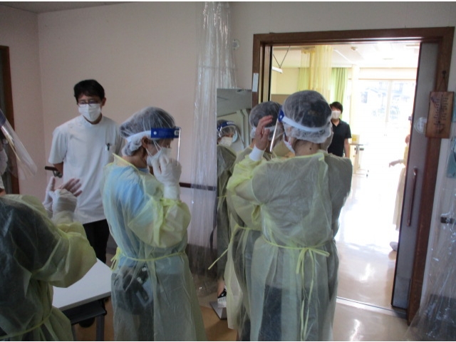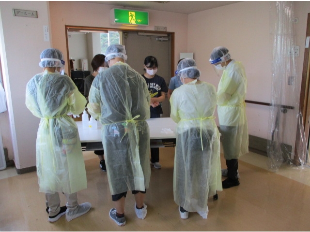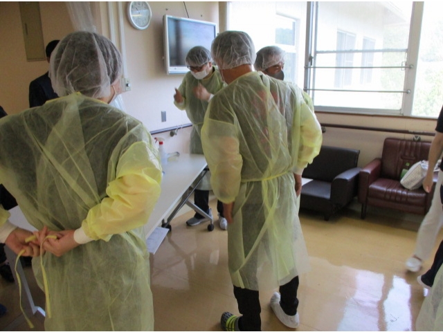 2人1組になり、手指消毒の方法、防護具の着脱等を支持し合いながら学び、すぎのきの里コロナ体制マニュアルに沿って、非感染区域から感染区域、また非感染区域へ行くまでを実践しました。