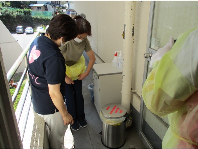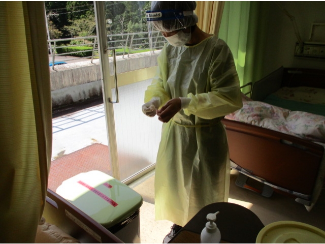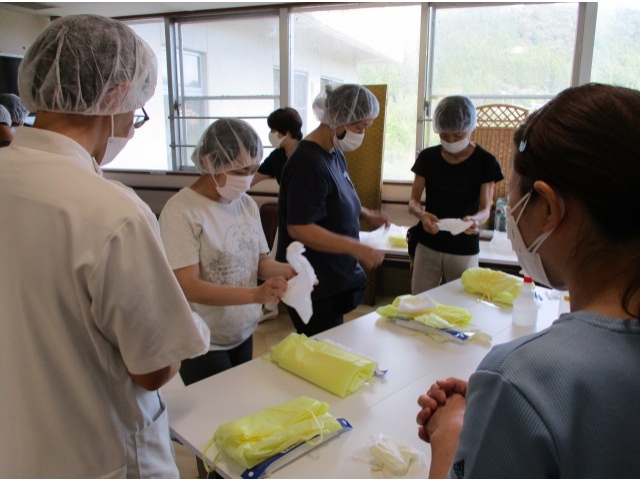 毎年必ず行っている感染症予防研修を、今年度は隔離部屋の対応を迫られた時を想定して実践的に行いました。(2回目)