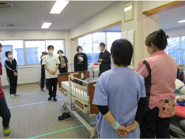 今回の研修では職員がモデルとなり、いつもの体位変換、ポジショニングを行って