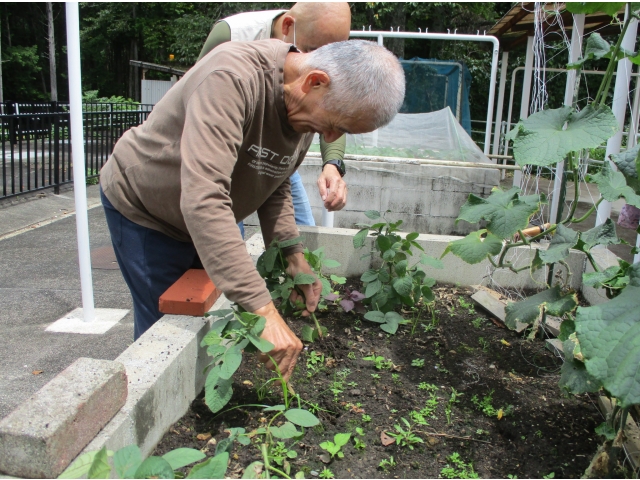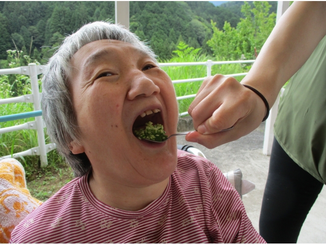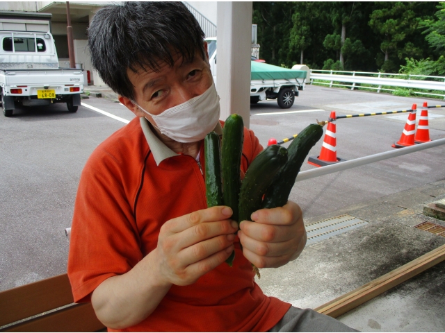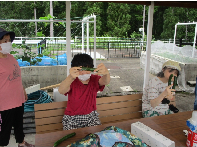 立派に育ったキュウリをみんなで収穫しました! 塩をパッパッとふって、夏の風を感じながらその場でおいしくいただきました。