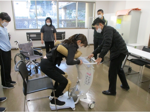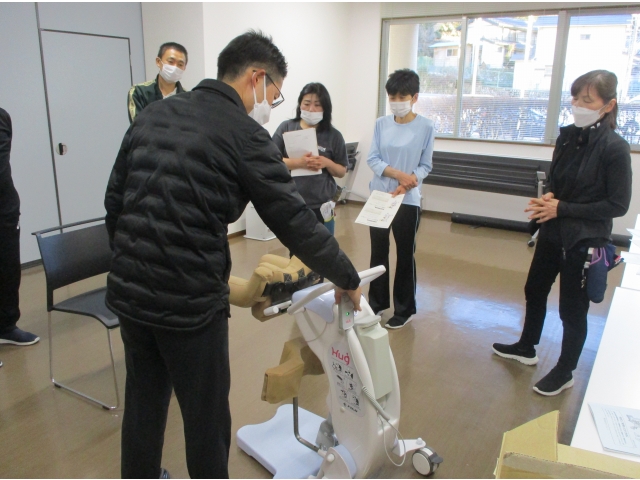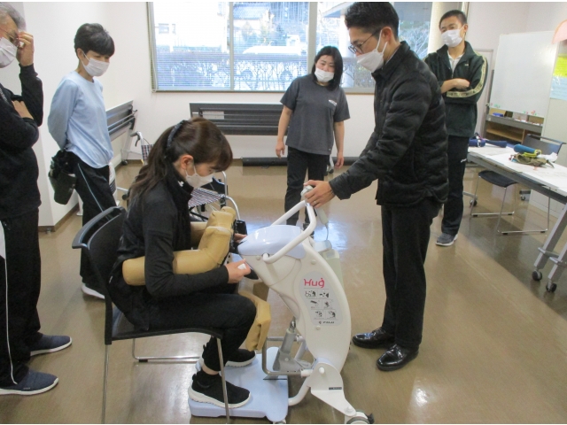 介護ロボット等の導入に向けて、さまざまな取り組みを行っています。今回は、移乗サポートロボット「Hug(ハグ)」を試行する事になり、担当者の方から操作説明等をしていただきました。