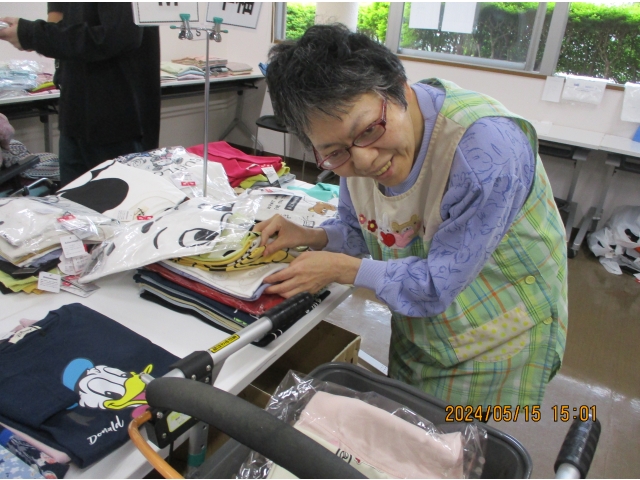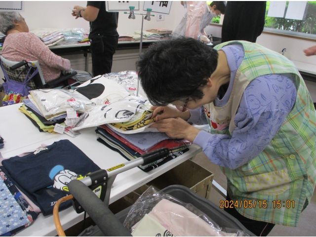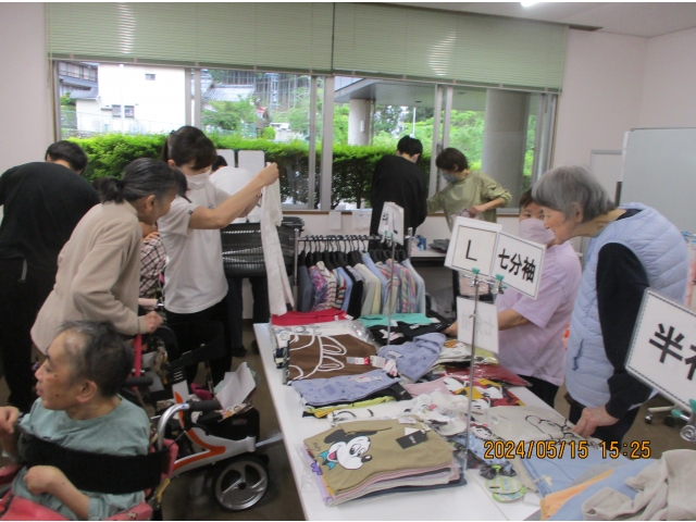 衣類の販売を、業者さんの協力により行いました。 男性はさっぱり短時間で決めて終了女性はじっくり見て、考えて・迷って・迷って決められていました。 みなさん満足そうな顔をされていました。