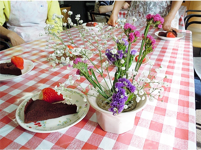 今月は母の日をイメージして、カーネーションを活け、チョコレートケーキを作りました。