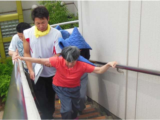 利用者さんの中には、普段は階段を使用されない方もみえますが、職員とともに一段ずつ階段を上り、無事に屋上にたどり着くことができました。