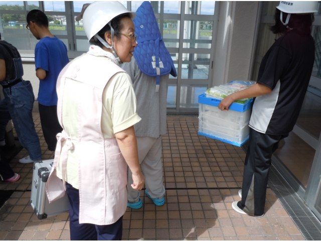 毎月行っている防災訓練のおかげもあり、 慣れた様子で防災ずきんを頭に被る利用者さん。 利用者の皆さんは、放送の指示や職員の声掛けに しっかり耳を傾け、速やかに避難を開始することが できました。