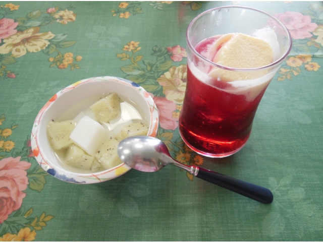 - 杏仁豆腐にキウイもミックスしてクランベリーフロートと一緒に!