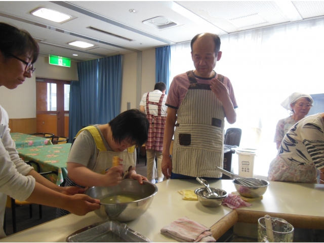 - 皆で手分けして材料を混ぜたり、バットに移したり・・・