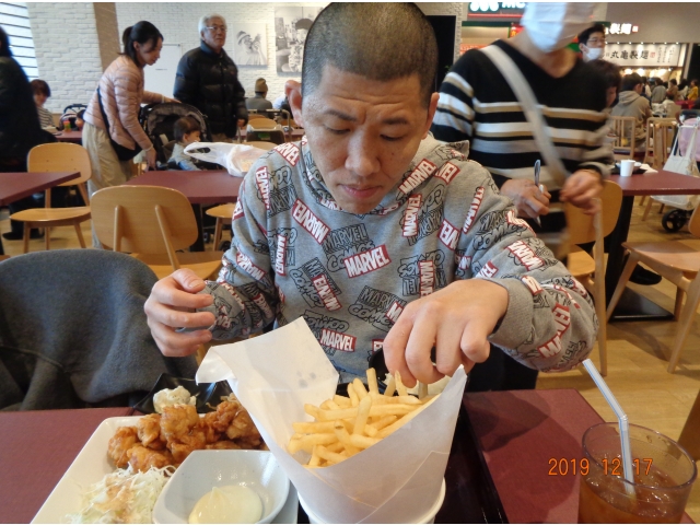 12月17日(火)にmozoワンダーシティへバスハイクへ行ってきました。写真は昼食の様子です。「食べたいものを食べる。」これだけでも幸せですが、さらに「食べたいだけ食べる。」が加わると嬉しいですね。ラーメンやポテト、かつ丼やからあげが人気でした。フードコートで食べましたが、近くで大きな音や話し声でざわざわしていても、見向きもせず堪能されていました。