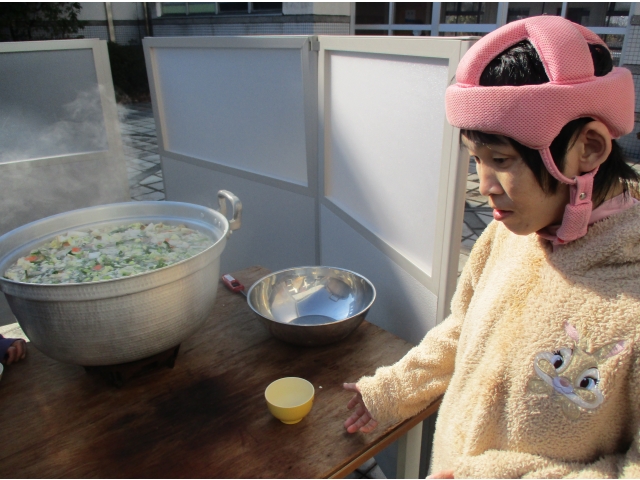 12月28日の午前、コロナ禍レクリエーション企画で豚汁の炊き出しを行いました。年末寒波の中、あったかーい豚汁を堪能しました。おかわりに来られる利用者様もおられ、お腹一杯になったのではないかと思います。