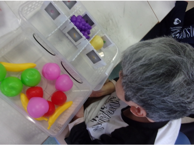(職員)「次はバナナ。あ、バナナは果物だね(汗)。これは~ここだね(入れる場所を指差して入れる)。」