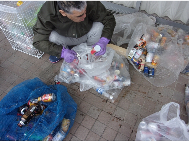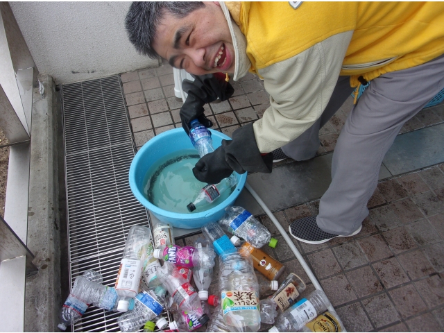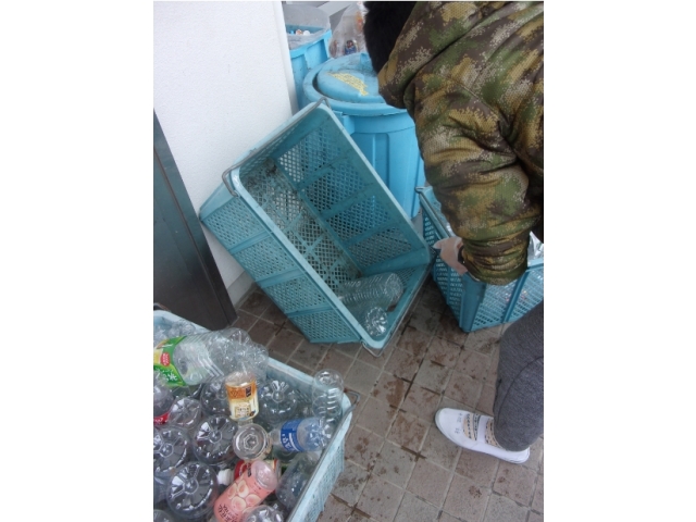 資源班では、ペットボトルはキャップと本体を分けて洗浄をし、きれいに並べて乾かし、つぶしてコンパクトにしリサイクル業者に回しています。缶もアルミ缶とスチール缶に仕分けし、つぶしてコンパクトにして近隣の事業所に納入しています。