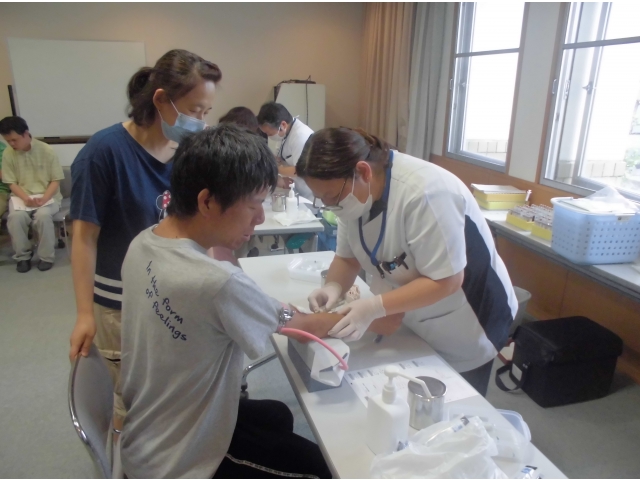 定期検査として血液検査・心電図・レントゲンの項目を実施させていただきました。 職員の誘導・補助のもと、利用者様には順番待ちのご協力いただきながら全員終了まで約3時間近く要しましたが順調に実施させていただきました。