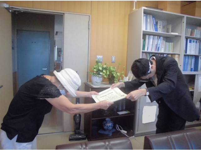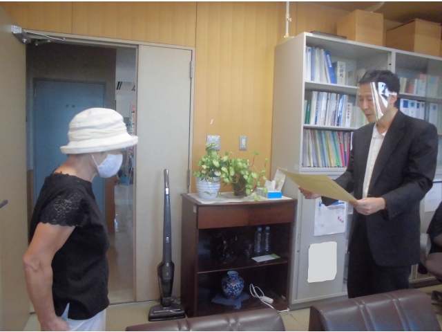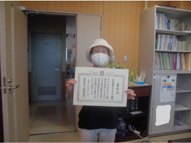 当施設で20年以上の永きにわたりボランティア活動(利用者様への体力づくり体操)のご尽力をいただいている団体様に愛知県から表彰状が贈られました。 本来は県庁にて知事から授与のところ緊急宣言に伴う中止のため施設でのお渡しとなったのが申し訳ありませんでしたが、この場を借りて改めて感謝の意を伝えさせていただきました。 感染収束の時期がきましたら、ご活動再開のお申し出をお待ちしております。