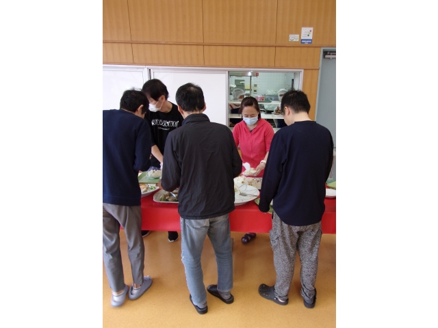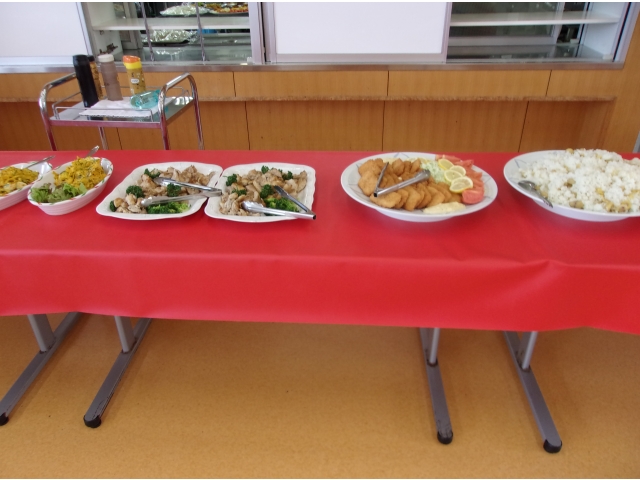 今日は、昼食バイキングの日でした~☆メニューは、くりごはん、えびカツ、ローストチキン、サラダ、デザートです!皆さんとても楽しみにしていました~!お腹いっぱいでもう食べられませーん♪とてもおいしかったでーす☆