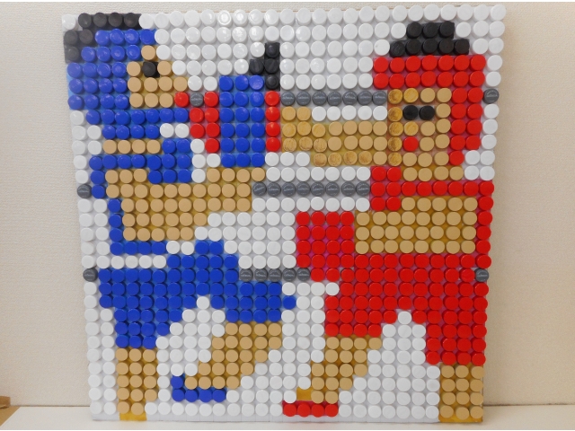 私たちは格闘技に決まり、ボクシングのシーンを作ってみることにしました。デザインを考えることに一苦労。900個のキャップで人の動きを表現することが難しく、なかなかイメージ通りにはいきませんでしたが、みんなの頑張りで、完成した作品は納得できるものになりました。