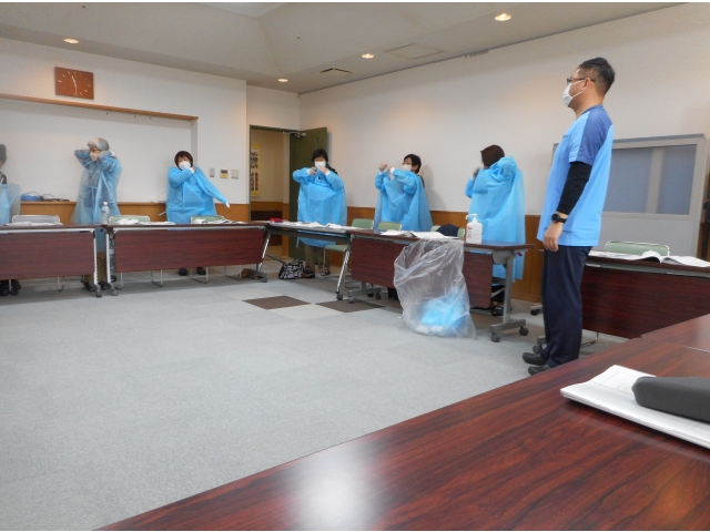 年度が替わり新しい職員も仲間入りしたグループホーム。会議を実施し、事業所の方針などを伝えるとともに、今回は予防着の扱い方を学んでもらいました。実際に感染者が発生する前にできれば良かったのですが、経験を踏まえた上での学習です。実際にやってみて理解できることも多かったと思います。感染を広げないためにも正しい方法を身に着けることが必要です。