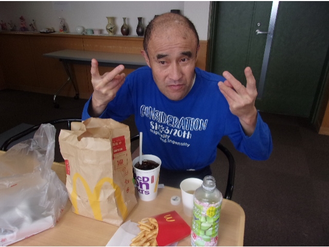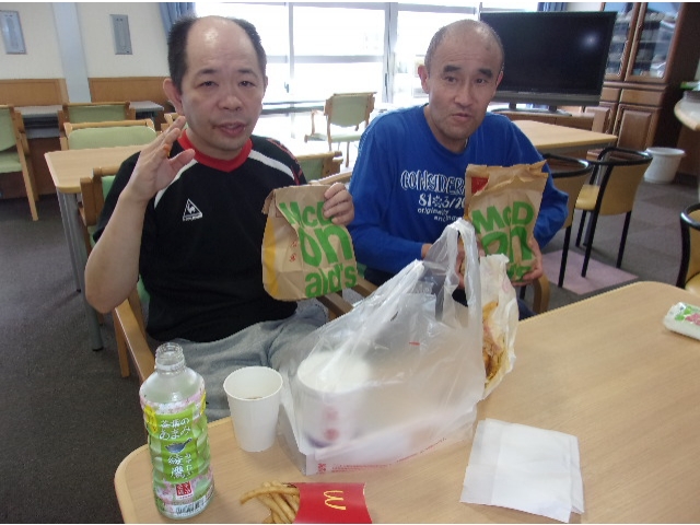 利用者さんは約半年に1回の頻度で余暇外出でお出掛けします。余暇外出では車に乗ってドライブを行い、徐々に落ち着き始めていますがまだコロナ禍で外を歩くことが出来ないため、かわりに職員が利用者さんの希望したご飯を買いに行きます。今回は利用者さんがハンバーガーを希望されたためマクドナルドのハンバーガーを購入しました!久しぶりに食べるハンバーガーに舌鼓を打っていました!°˖✧◝(⁰▿⁰)◜✧˖°