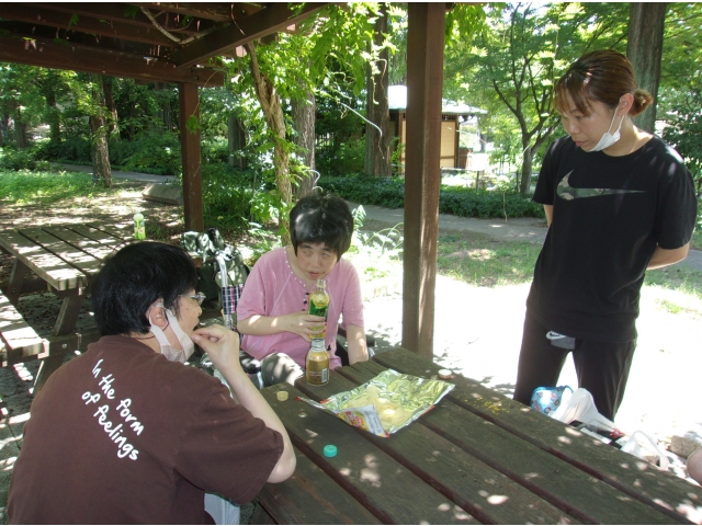 本日午前中に数人の利用者さんと余暇外出へ出掛けました。行き先は戸田川緑地公園です。公園に向かう途中にコンビニへ立ち寄り、お昼ご飯を購入しました。皆さん何を食べようか悩みながら購入されていました。公園到着後昼食を食べ、その後公園内を散策して帰所されました。