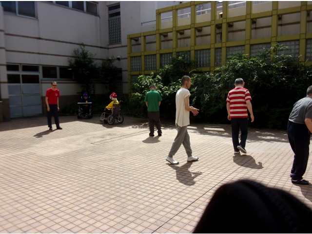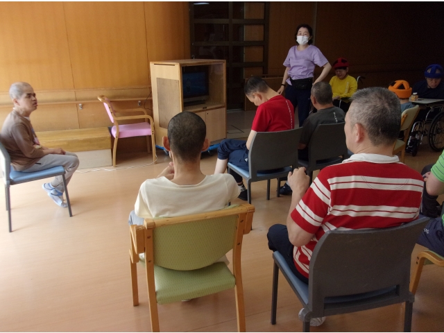 平日の午前中には3つのグループに分かれて活動を行っています。 第3活動班はVTRを観ながらの体操からスタートします。 天気の良い日には中庭に出て日向ぼっこをしたり、それぞれの体調に合わせて歩いたりして、身体を動かしています。 天候や季節によっては、指先を使った作業の練習やタオルたたみの練習、ボウリングなど、楽しみながら活動をしています\(*^^*)/
