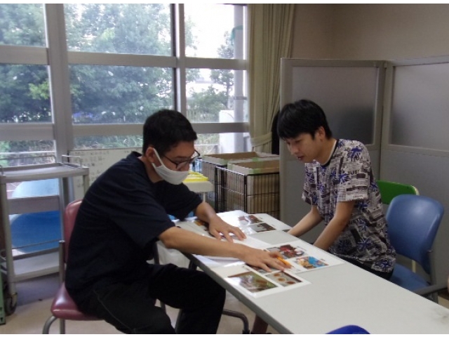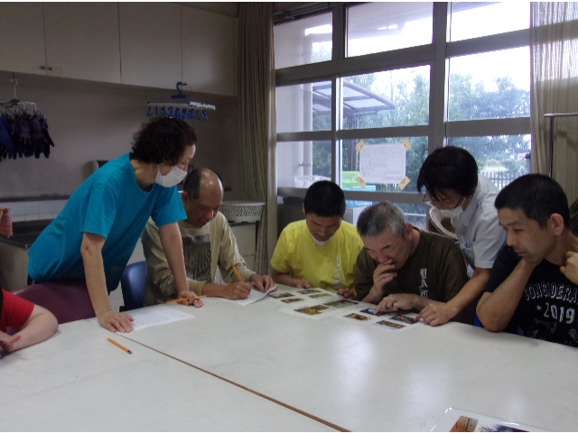 利用者懇談会を行いました。今月のテーマは9月に行われ好評だった「秋まつりについて」です。秋まつりで行われた、きんちゃん体操・ウインドアンサンブル・太鼓・水風船・クイズ・ビンゴ・ヒストリームービー・カラオケ・模擬店ご飯の中から楽しめたと思うものを各自2つ選んでいただき、丸印で記入していただきました。それぞれ行われていた写真をラミネートしたものを見比べ、楽しかった思い出を思い出したのか、笑顔になりながら選ばれていたのが印象的です!